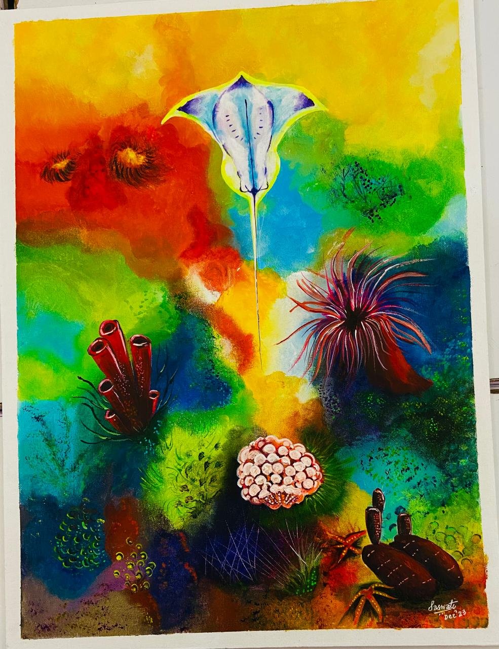 This is depicting under water creatures like coralsand sea anemones in vibrant hues of red, yellow, green etc. Depicts a sense of depth.
