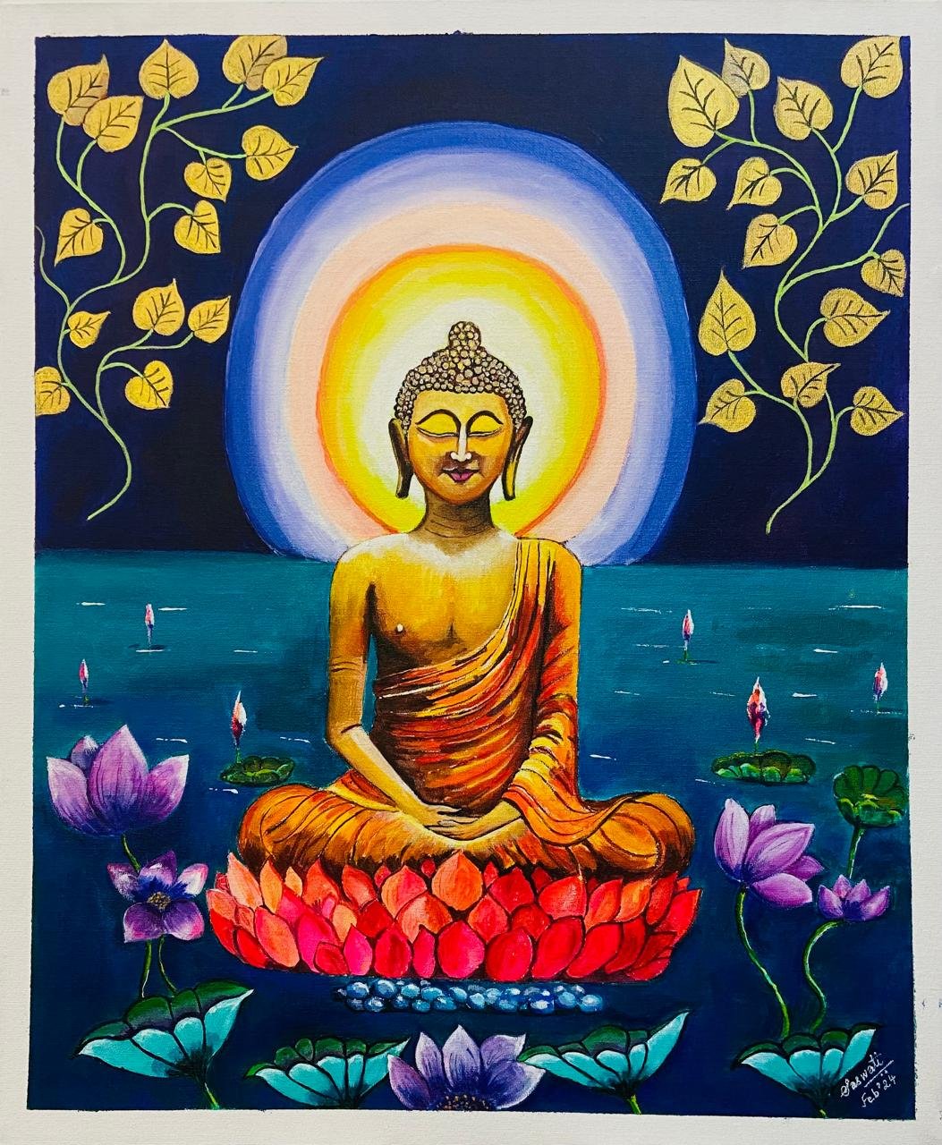 Lord Buddha in a meditation pose ; floating on a water body and with colourful lotus all around